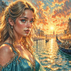 Young Woman by Canal at Sunset in Venice
