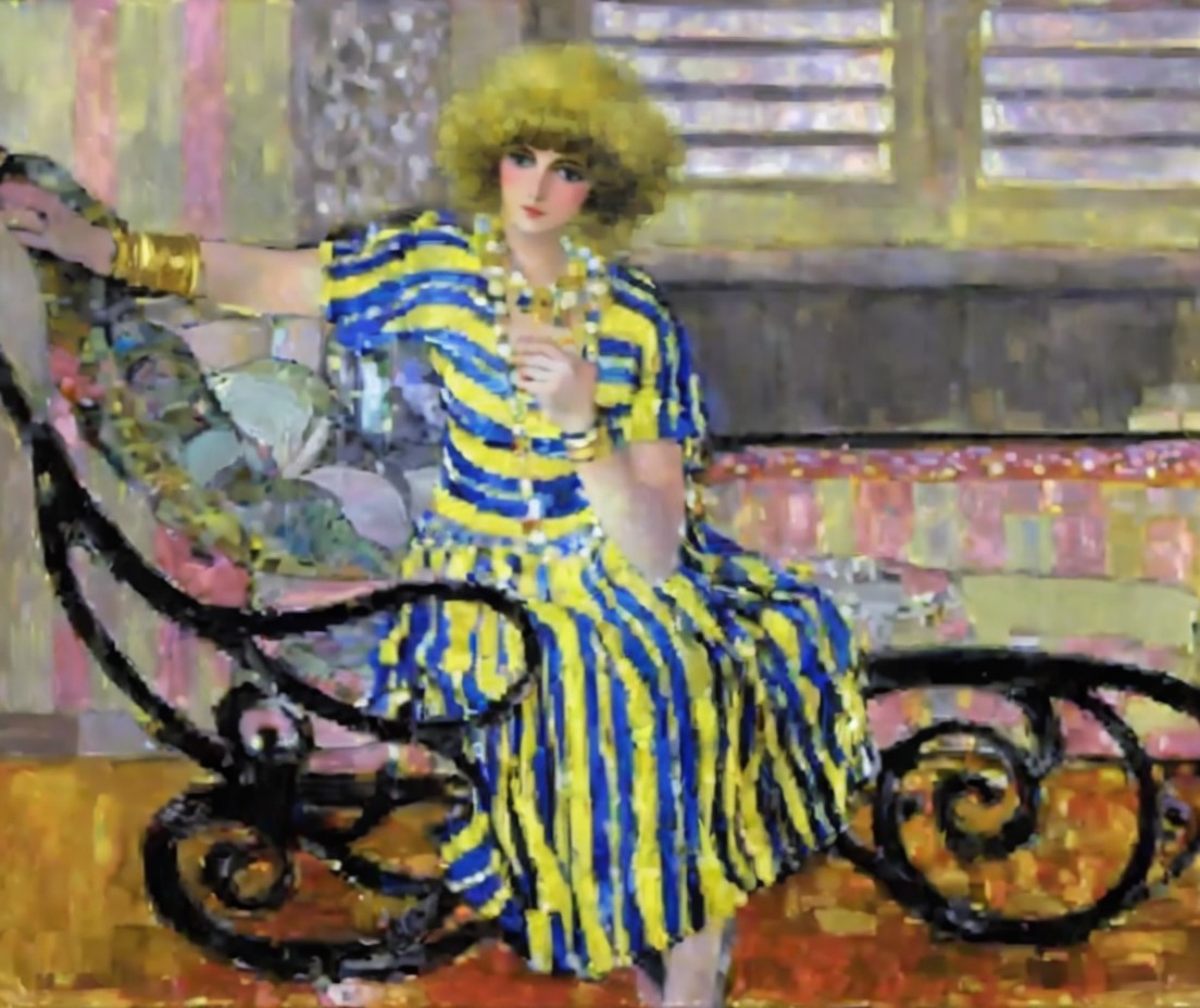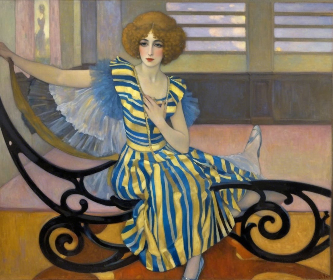 A glamorous woman in a striped blue and gold dress lounges elegantly on a curved chair, with a moonlit night visible through the window, exuding vintage charm and sophistication.