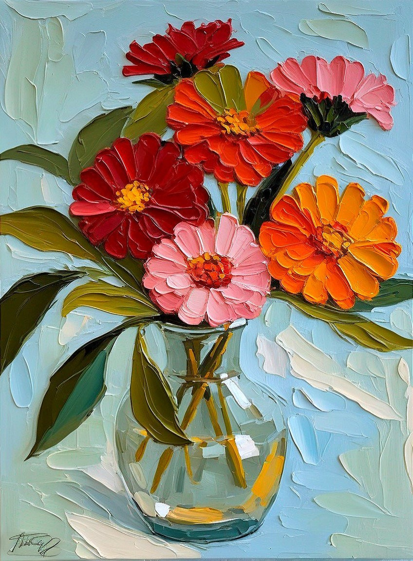 A vibrant painting of colorful flowers in a clear vase, featuring thick, textured brushstrokes and a lively palette.