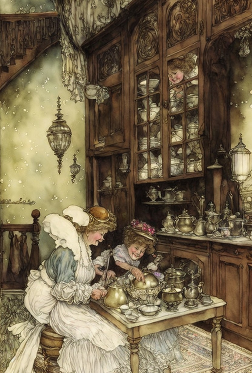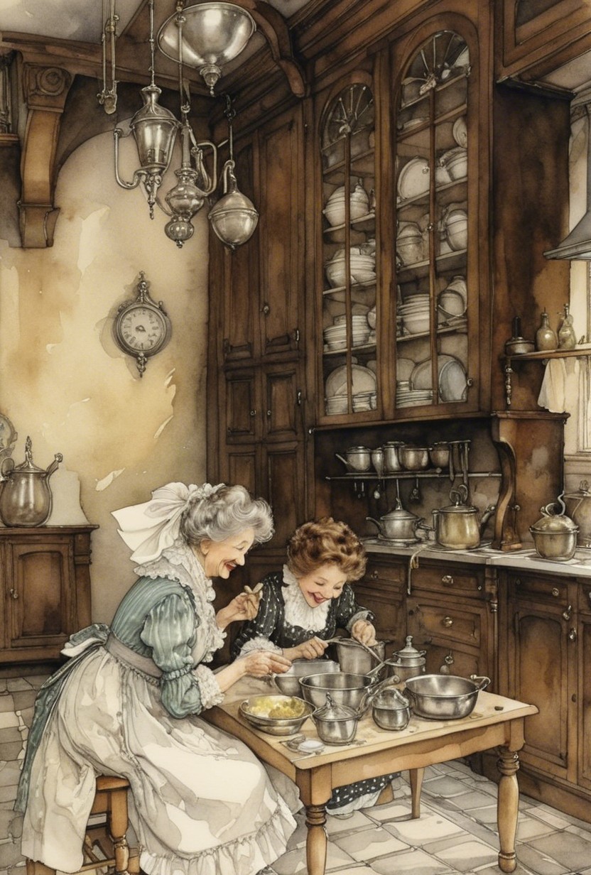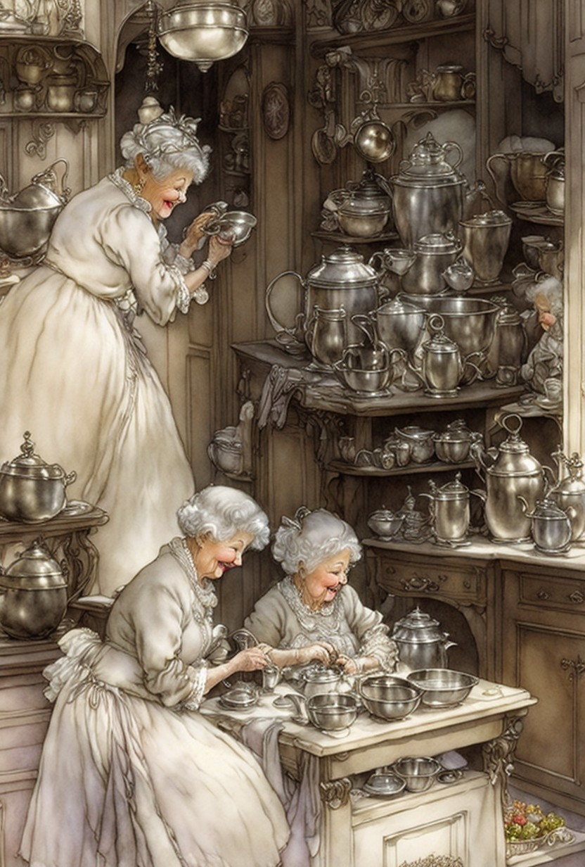 Three elderly women in vintage clothing occupy a cozy kitchen. One stands atop a cabinet, organizing silverware, while the others sit at a table, preparing food, surrounded by gleaming pots and dishes.