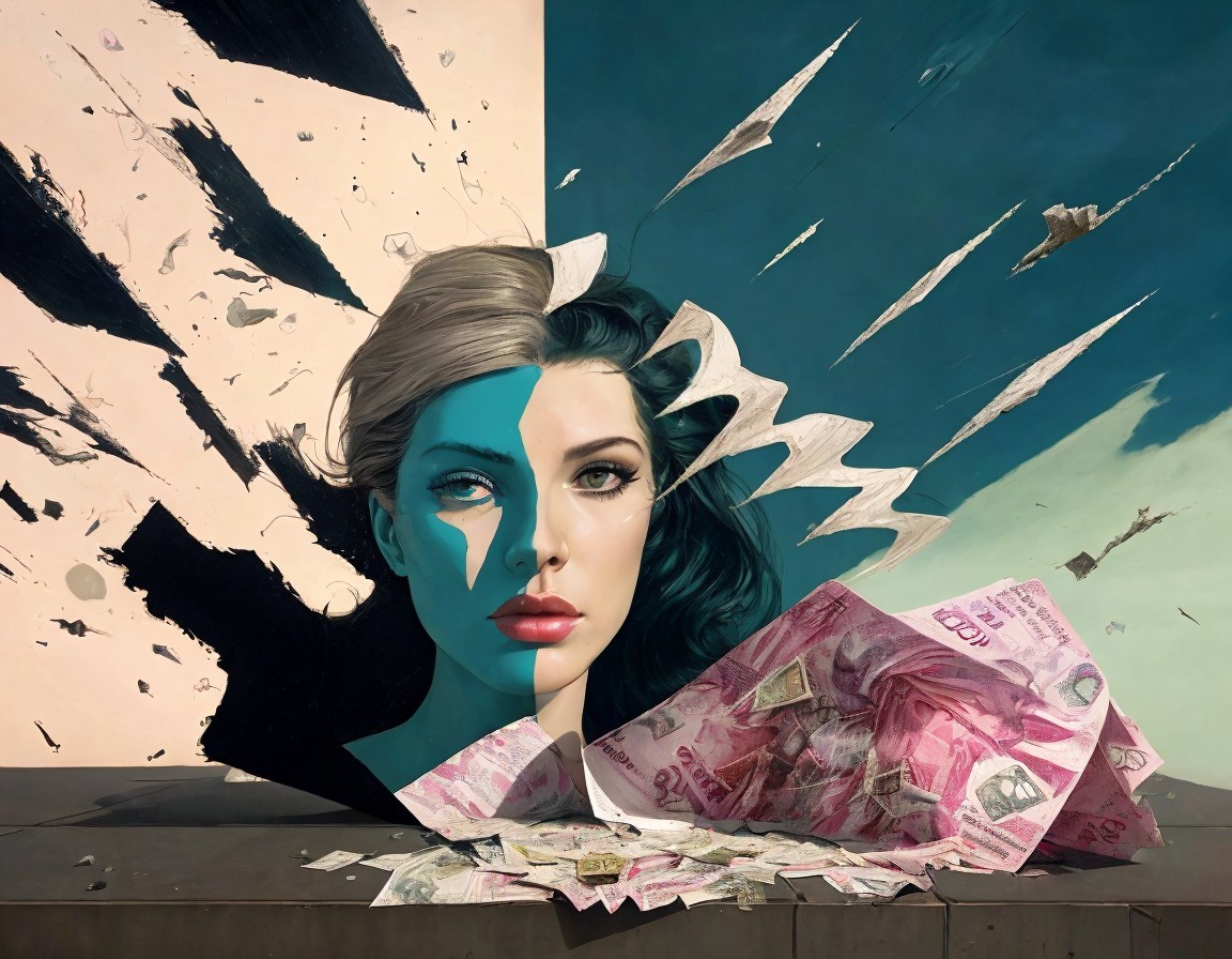 Prompt: Surrealism, Neo-noir, letter graphics, post-apocalypse,The gusty wind turned the paper money into a tornado, into rubbish, knocking people off their feet, diamond dust flying in their faces, style by David Piddock, by Richard Hamilton, by Erik Jones, oil on canvas, crisp quality, futuristic, science fiction, linsanely intricate details, soft mist, realistic texture,