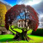 A surreal depiction of a woman’s face emerging from a tree, surrounded by vibrant autumn foliage and a tranquil lake, blending nature and human features in a dreamy landscape.