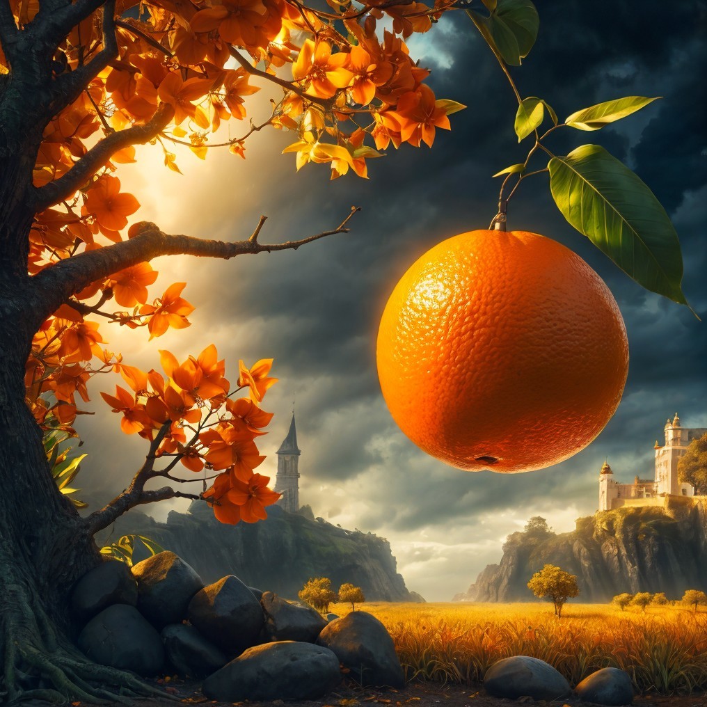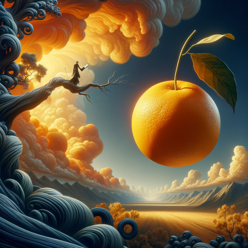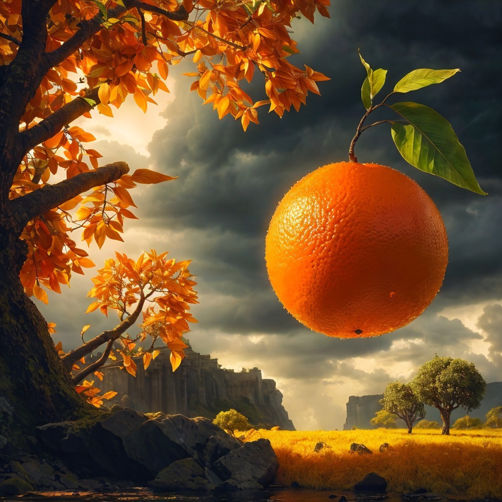 A surreal landscape with a giant orange floating, a person looking up at it, and trees with autumn leaves under a dramatic sky.