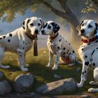 Three Dalmatian dogs are depicted in a serene, natural setting. One wears a decorative collar, while the others sit attentively, surrounded by greenery and softly lit by gentle sunlight.
