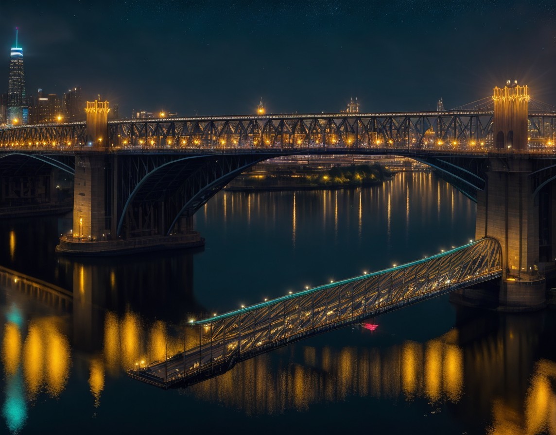 Prompt: In the nocturnal city, the Northern City Bridges emanate a majestic glow, showcasing their architectural beauty over the tranquil river. The lights of the bridges contrast with the dark background, emphasizing their elegance in the urban landscape. The artistic painting technique highlights architectural details and narrates the story of bridges connecting people's dreams. Depicted as connected crowns of diamonds, the bridges serve not only as landscape elements but also as a source of inspiration and reflection on the beauty of architecture. Inspirations style of Jacques-Louis David, Jean-Auguste-Dominique Ingres, Baroque, Renaissance, Charles Méryon, Vincent van Gogh, Frida Kahlo, Pencil drawing and pastels on paper, Oil on canvas, Pencil sketch, Realism, Impressionism, Surrealism, Realism, Pastel shades, subtle browns, muted grays, Pastel shades of pink, Turquoise, Pencil, pastels, paintbrushes, Camera, Detailed pencil drawing, delicate application of pastels for color highlights, Oil on canvas, Pencil sketch, Pencil, pastels, art paper, paintbrushes, Camera, Realistic Artists, Pastel Society of America, deviantArt, Instagram, Graphic tablet for digital detailing, precise traditional pencils, and pastels.