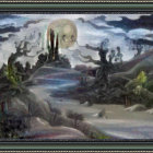 The artwork features whimsical, stylized animals, including large dogs and a penguin, sitting on a wall under a full moon. The scene blends muted colors with an imaginative, surreal atmosphere.
