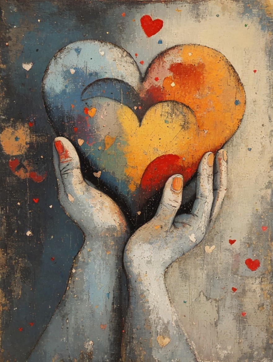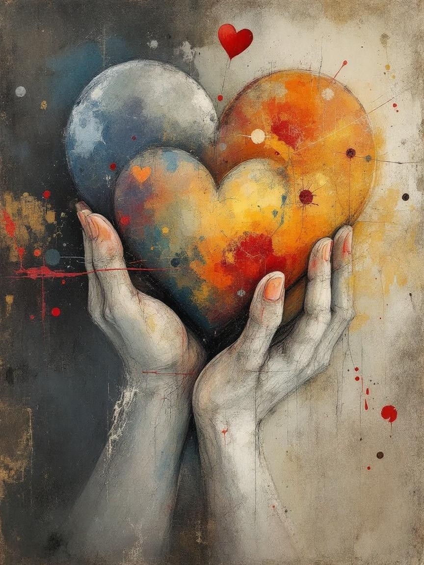 Cloud9, my heart lies in your hands, A moody backdrop creates an atmosphere of ethereal strangeness. High resolution fine detailed textures fine colors scratches, tears, burn marks, cracks in the paint in the mix style of Joan Miro, Gabriel Pacheco, antique extreme canvas textured"