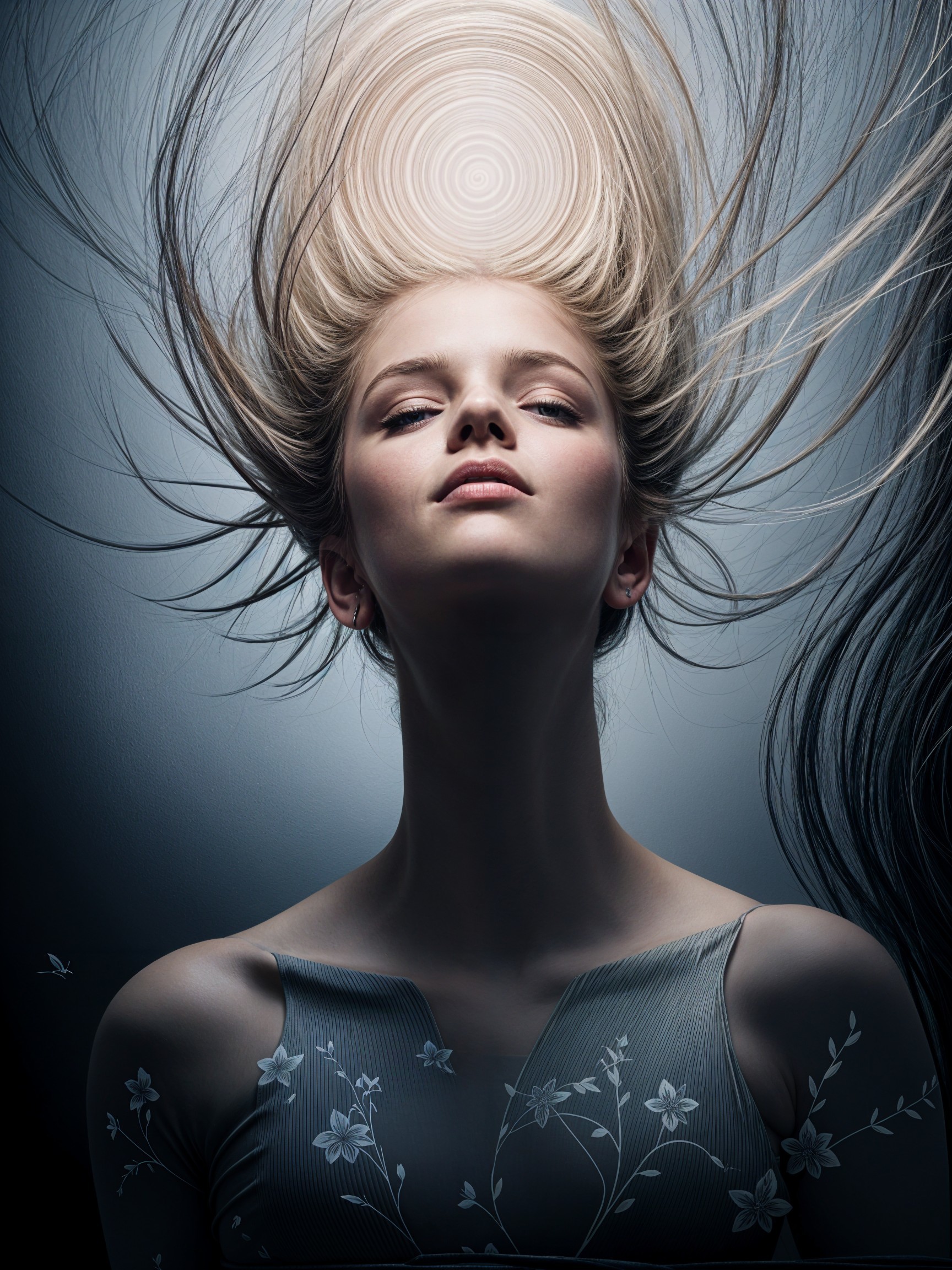 A serene portrait of a woman with flowing hair and a peaceful expression, set against a dark background. Bright light radiates from above, enhancing her ethereal beauty and captivating presence.