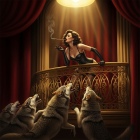 A glamorous woman in elegant attire smokes on a balcony, overlooking three howling wolves below. The scene is dramatic, with rich colors and spotlighting that creates an intense atmosphere.