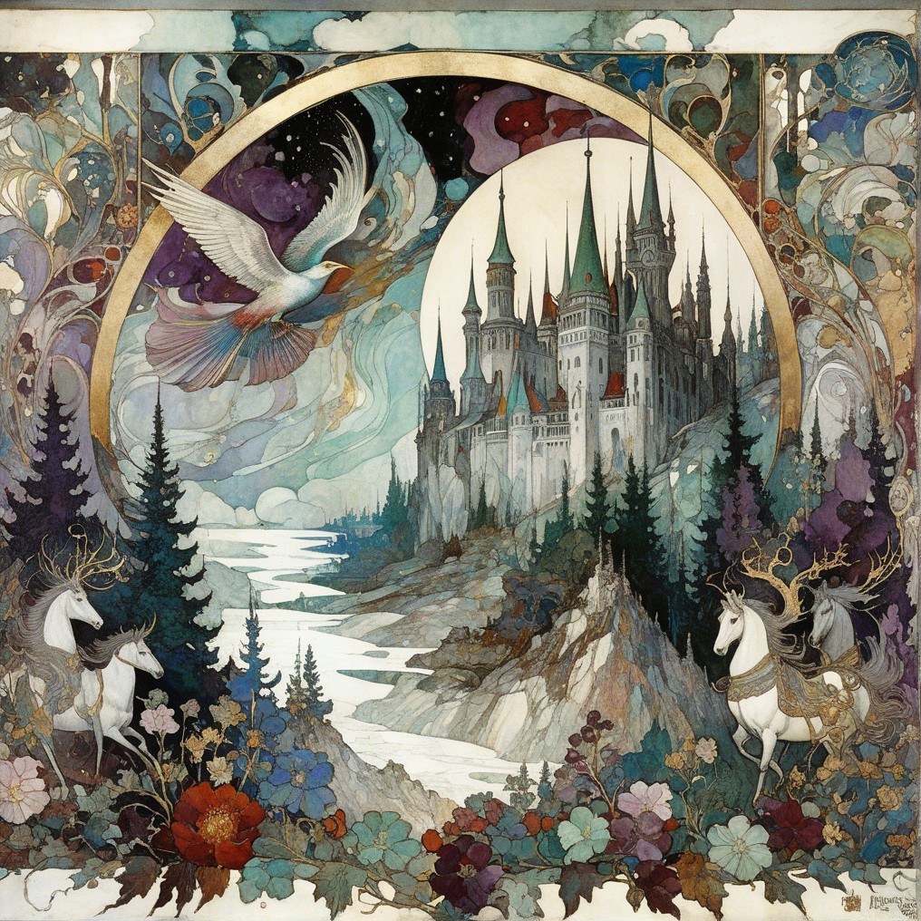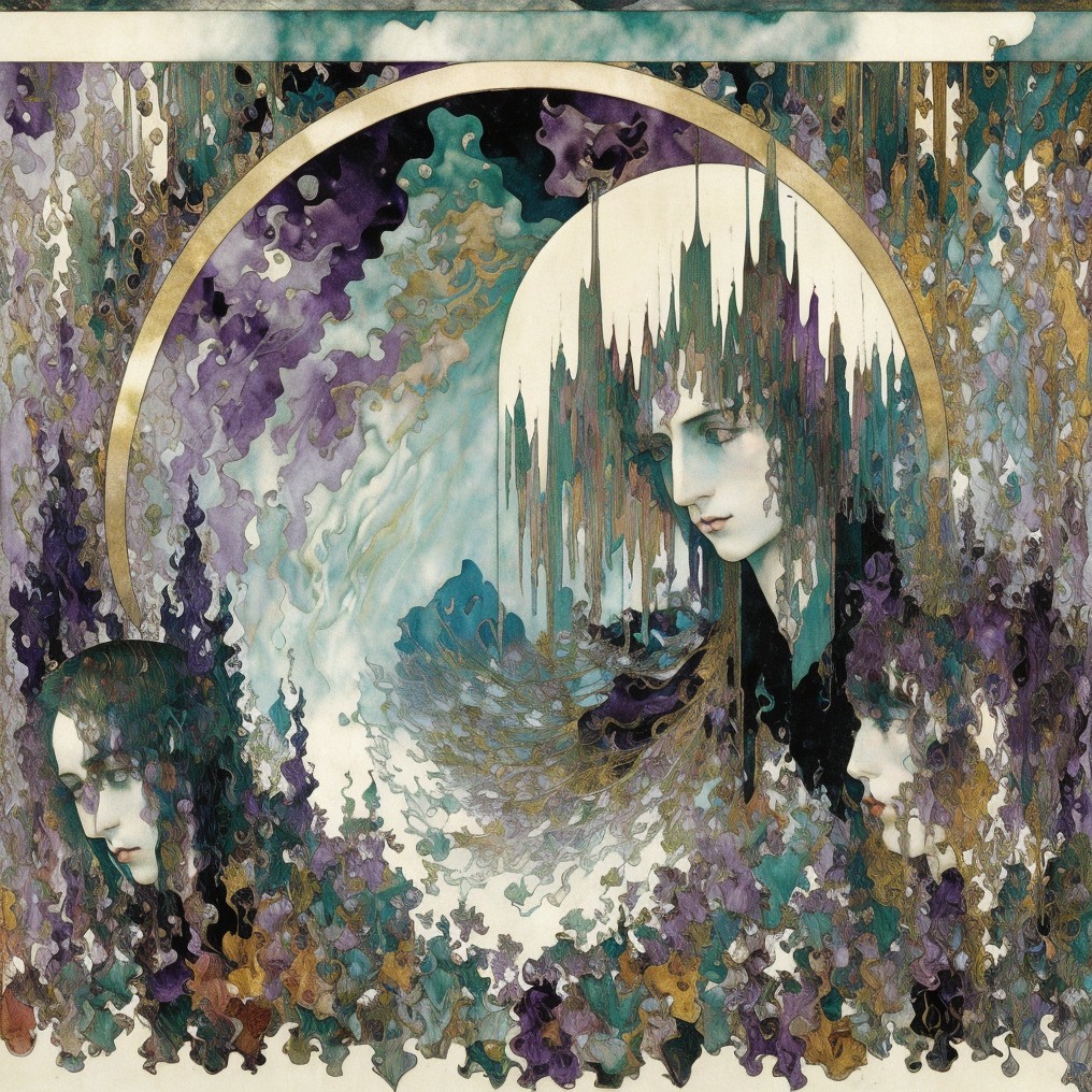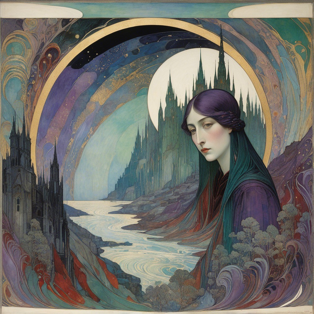 A serene woman in a flowing robe gazes thoughtfully from within a swirling, colorful wave, surrounded by rich blues and golds, evoking a sense of tranquility and mystique.