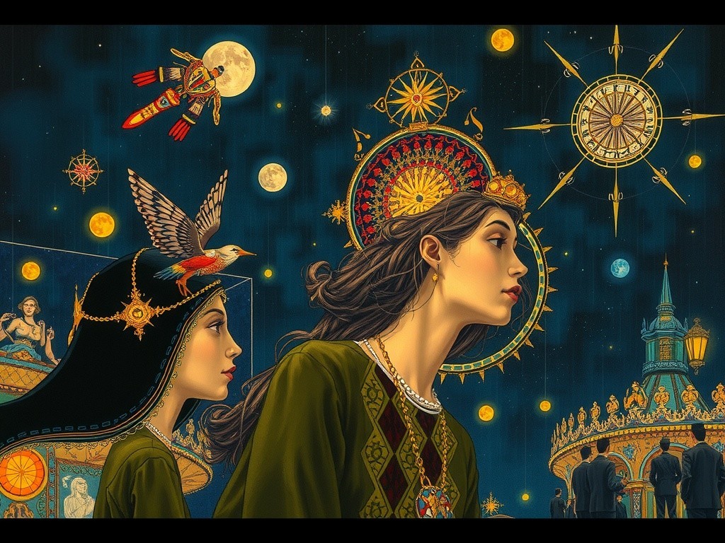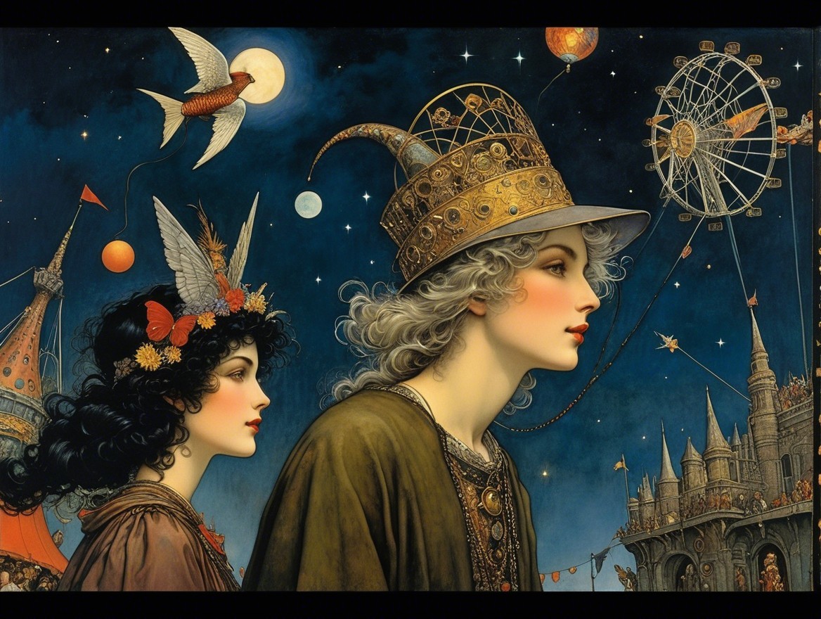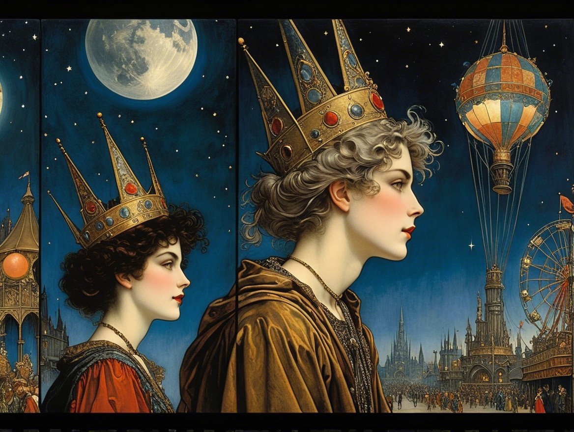 A stunning steampunk cityscape at night, featuring ornate towers, hot air balloons, and a vibrant sky. Festive crowds gather beneath a large moon and intricate, swirling architecture.