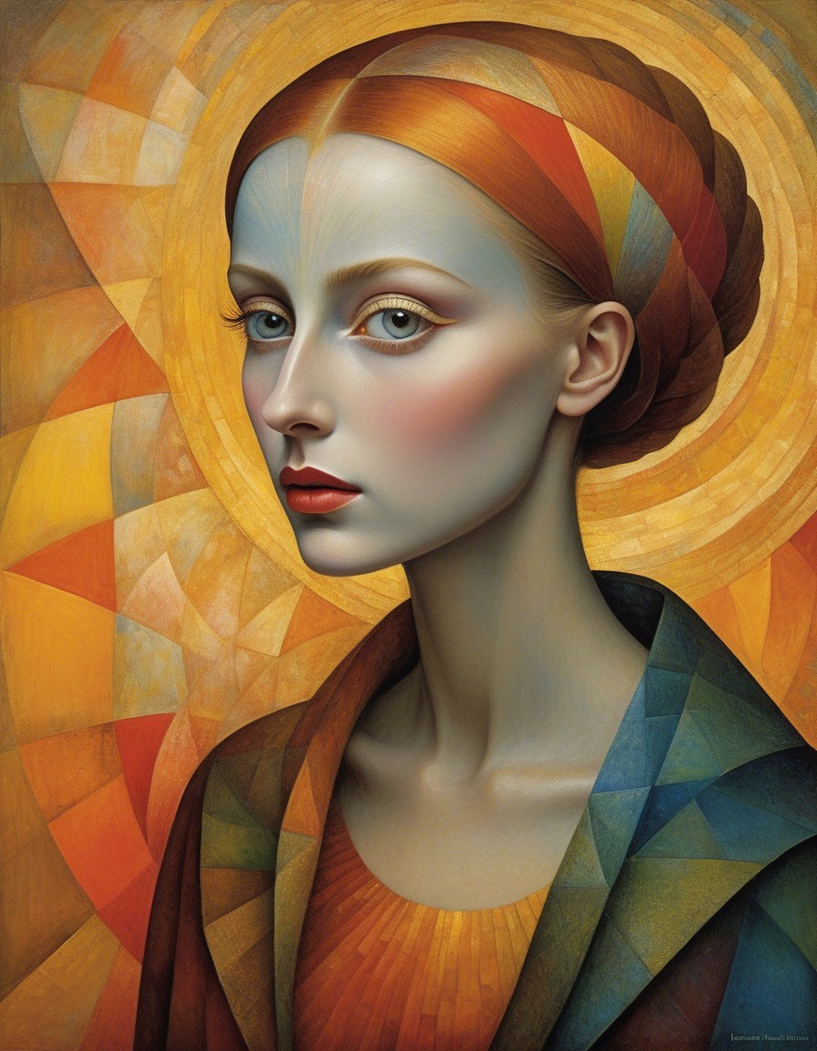 A digital art portrait of a woman with a swirled, vibrant hair design and colorful, draped attire against a circular, textured background.