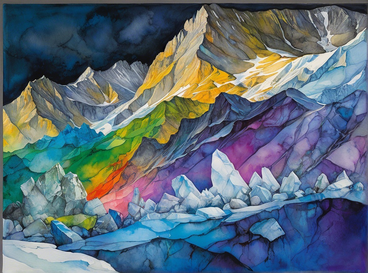 glacier with chunks of ice that have broken away, Illustration by Paul Davey, strong distinct foreground, very strong outlines, over-saturated colors, John Hoyland, Kim Keever, Thom, (champlevé) watercolor, pastel, ink , arthur rackham, monet, Dufy, Chagall, Crivelli, watercolor, pastel, ink painting rendered in plique-à-jour technique, style of Andy Kehoe...