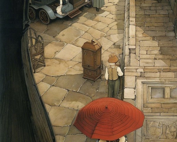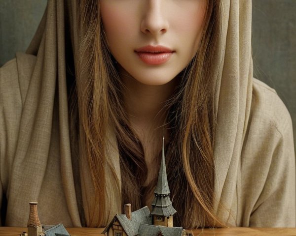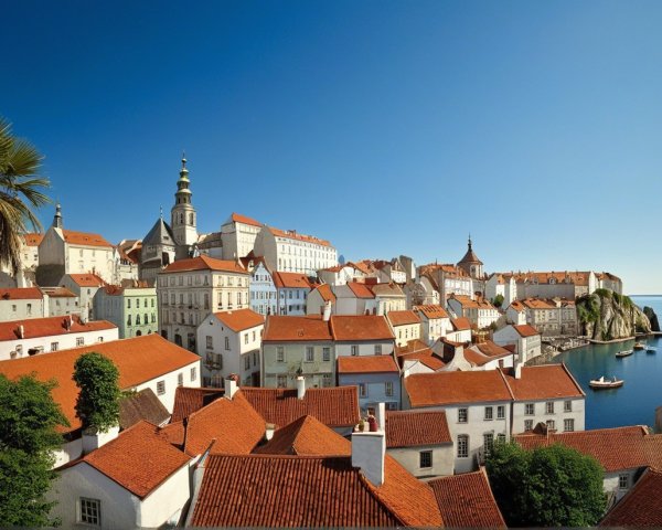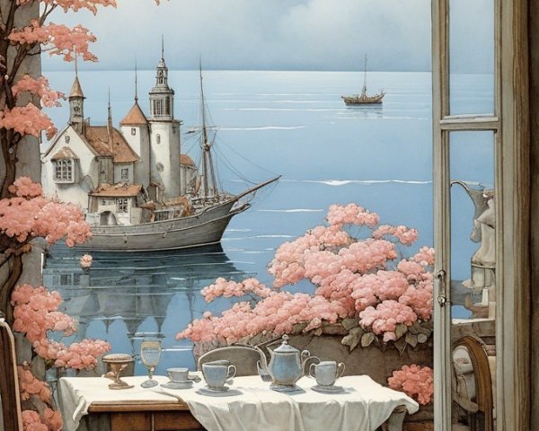 A surreal landscape featuring a tranquil sea with boats, a charming house by the shore, and towering mountains under a massive, glowing planet against a starry sky.