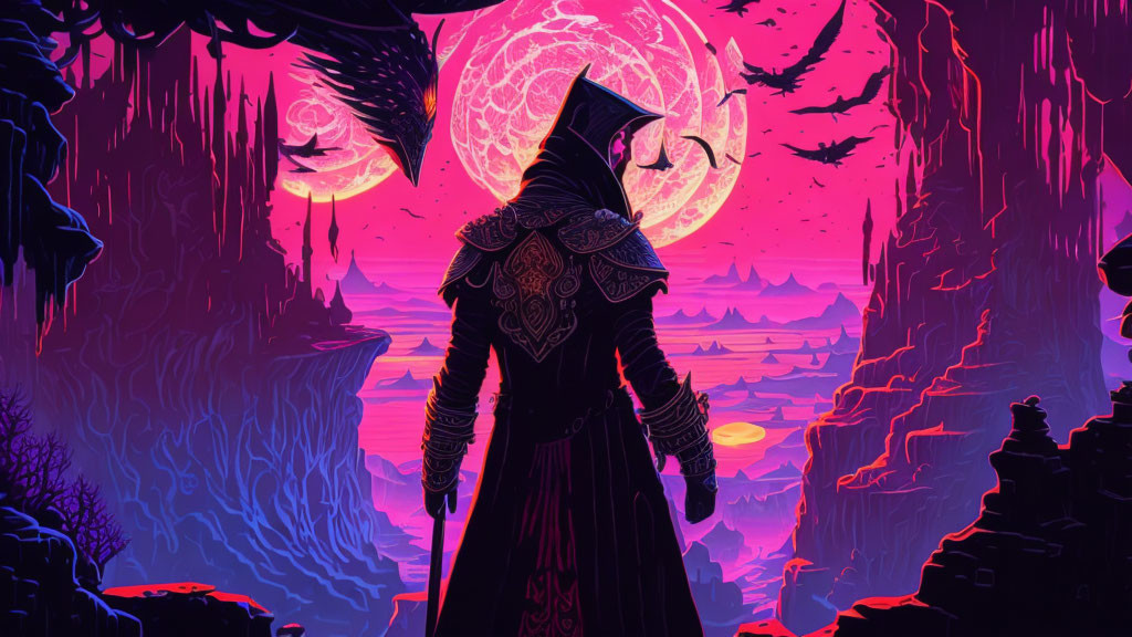 Cloaked figure in mystical landscape with moon and creatures