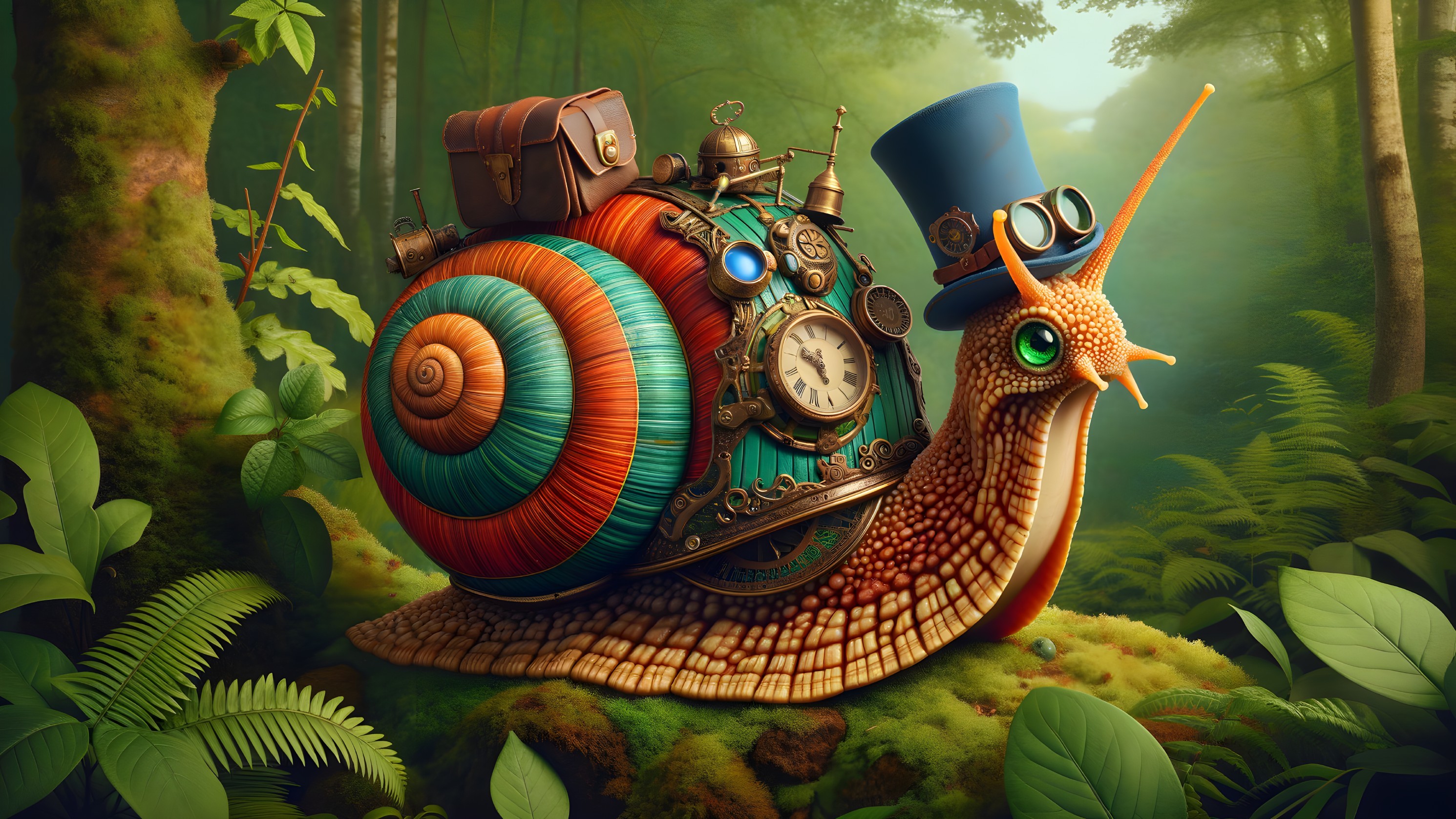 A whimsical snail adorned with a vibrant, spiraled shell and a top hat, featuring steampunk elements like gears and a clock. It's set in a lush, green forest, enhancing its fantastical charm.