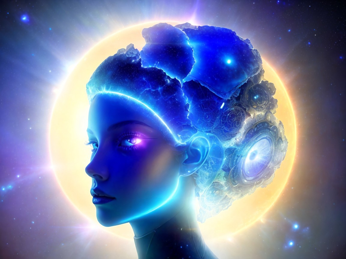 The image depicts two graceful profiles with intertwining cosmic elements in their heads, symbolizing a connection between human consciousness and the vast universe. Ethereal, dreamy tones enhance the surreal effect.