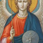 The image features a serene, ethereal figure draped in flowing garments of light blue and gold. With gentle wings and flowing hair, she embodies grace and tranquility against a luminous backdrop.