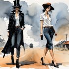 Two stylish women walk confidently down a dusty road, dressed in fitted jeans and hats. A vintage car is parked nearby, surrounded by a smoky, desert landscape.