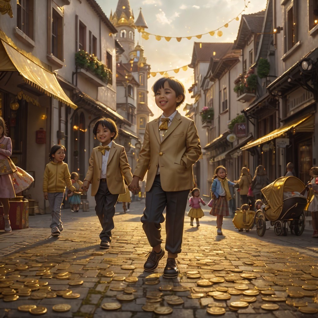 Prompt: Children walking on a road paved with shimmering gold coins, playful interaction, magical street scene, urban setting with buildings and passersby, warm golden light casting a surreal glow, whimsical and dreamlike ambiance, detailed and enchanting, fantasy elements, digital art medium, vibrant colors with golden hues, intricate architecture in the background, bustling atmosphere, joyous expressions on children's faces, captivating and imaginative, Artstation.