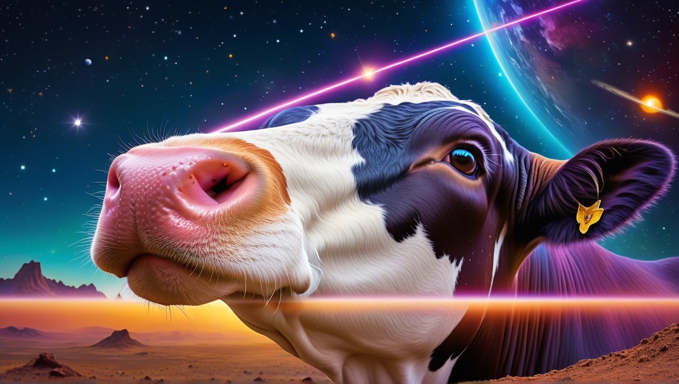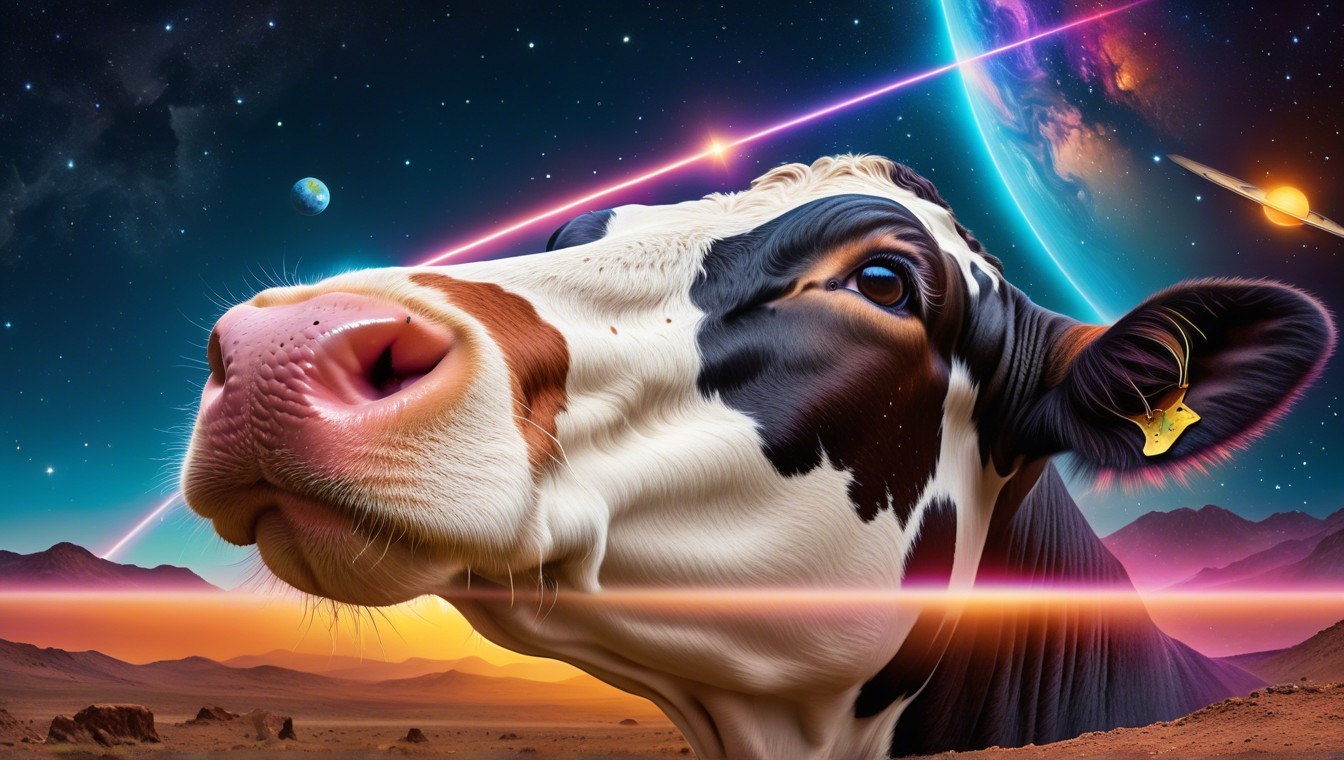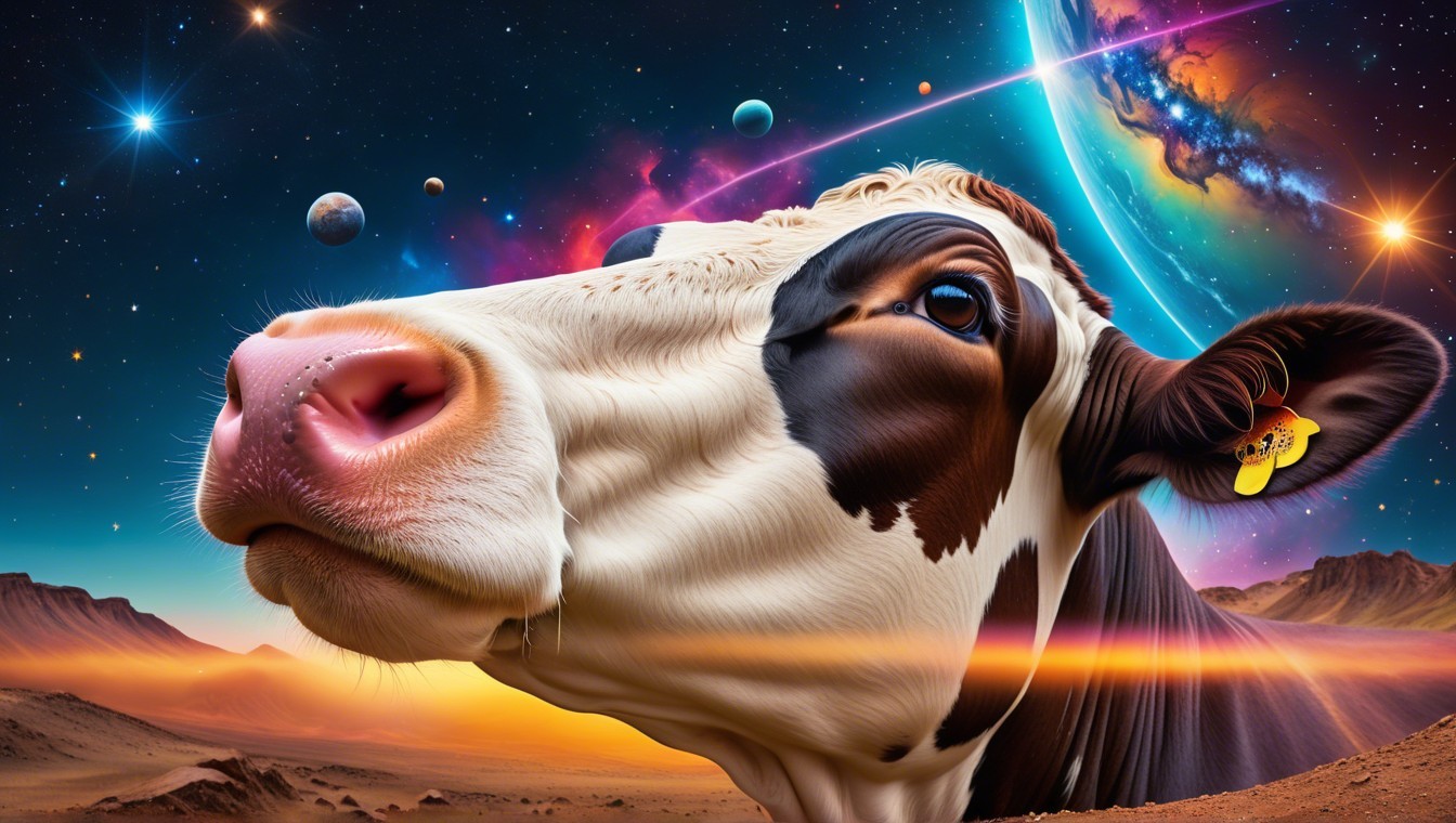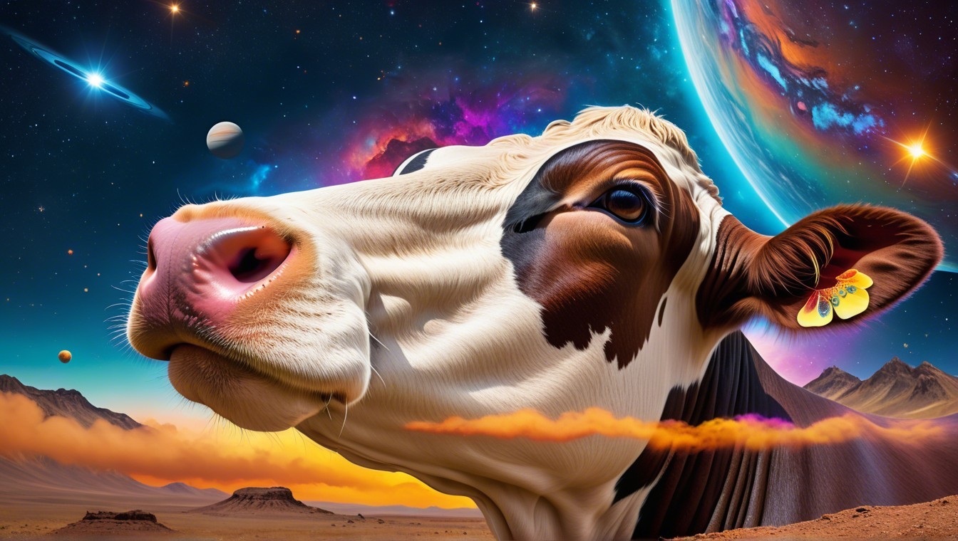A surreal scene featuring a close-up of a cow's face against a vibrant cosmic background with planets and galaxies, blending rural imagery with a fantastical space setting.