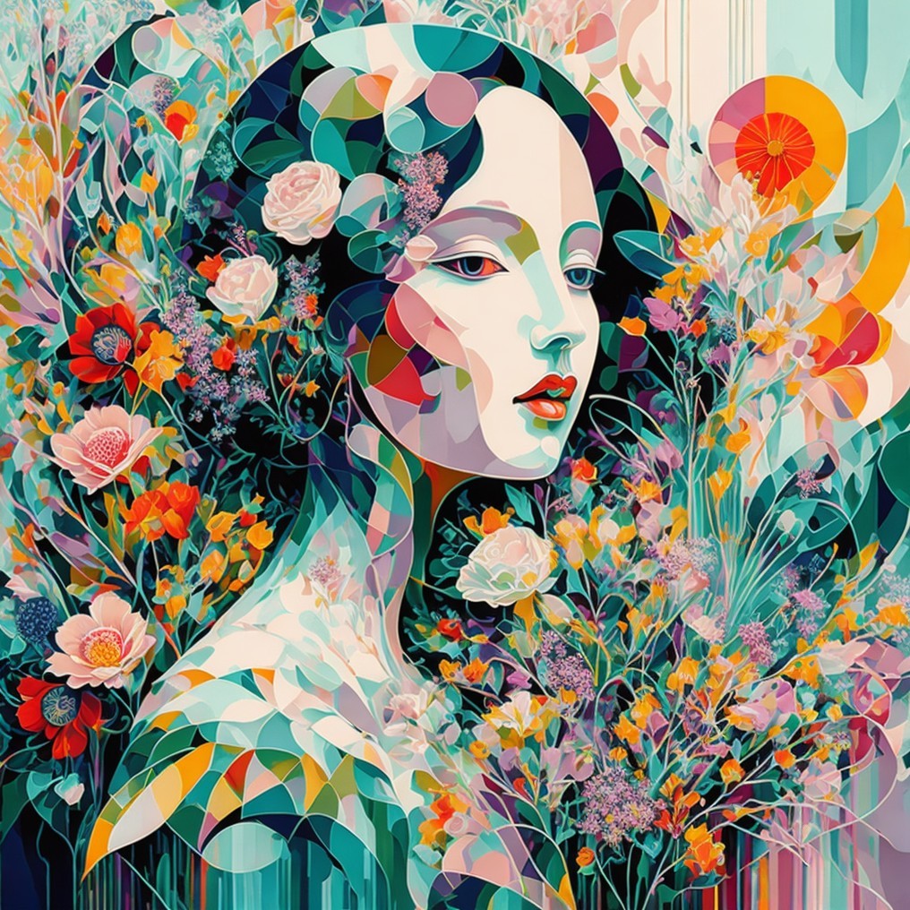 A colorful and stylized image of a woman's face surrounded by vibrant, abstract floral patterns in a modern art style.