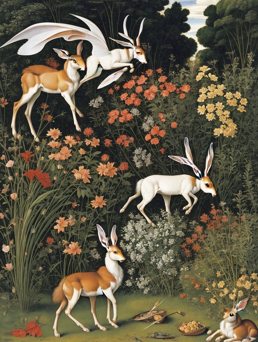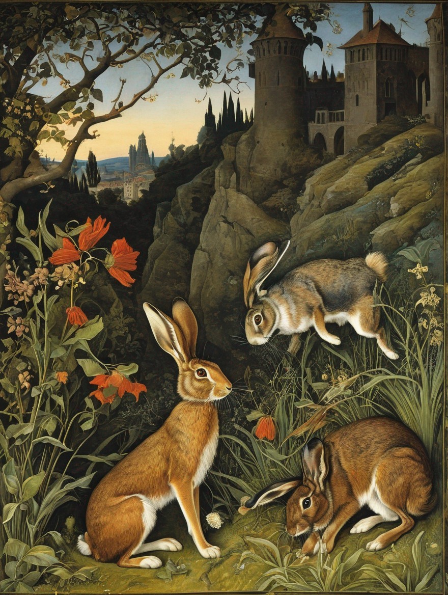 Two anthropomorphic rabbits in a lush, detailed landscape with a sun and moon visible in a clear sky.