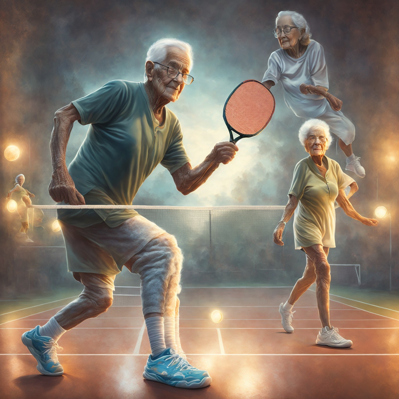Prompt: Black and white image of an elderly man with a leg and foot in a plaster cast, playing pickleball with an elderly woman. In the style of Stephen Gemmell.