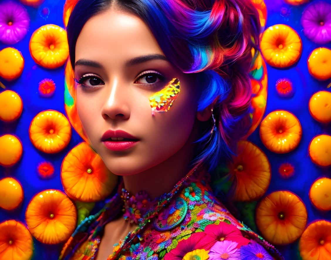 Colorful Floral Backdrop with Woman in Vibrant Makeup