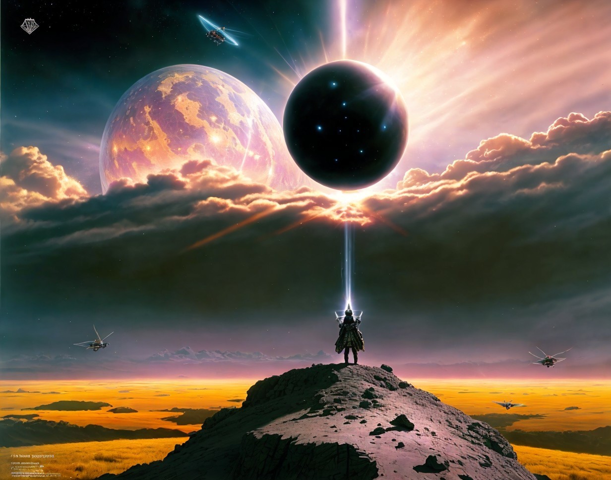 Prompt: master of reality burning heavy metal blending rock through the sky so vast, escape from alternative brainwashed minds past the stars in fields of ancient eternal spiritually focused void - all that is growing heavy metal energy within a vision hover wasps