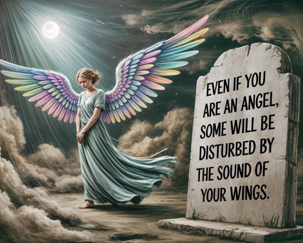 A celestial figure with majestic wings stands amid a dramatic landscape, illuminated by stormy skies. A massive hand reaches down, symbolizing a powerful connection between divine and mortal realms.