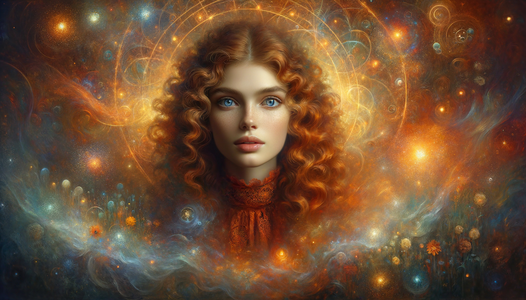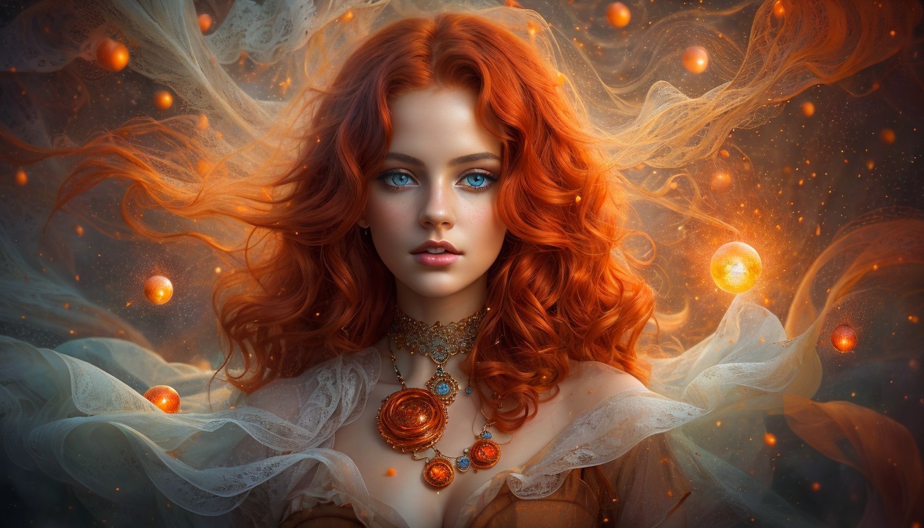 A digital artwork of a woman with flowing red hair, piercing blue eyes, surrounded by luminescent orbs and ethereal fabrics.
