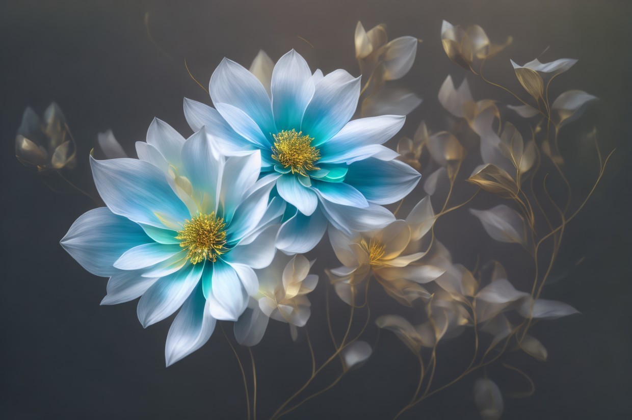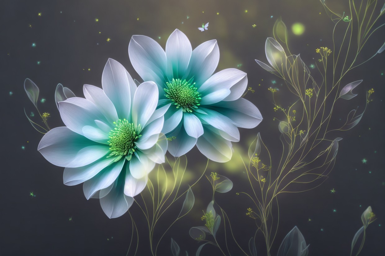 Two ethereal flowers glowing subtly against a dark background, accompanied by delicate foliage and floating orbs of light.