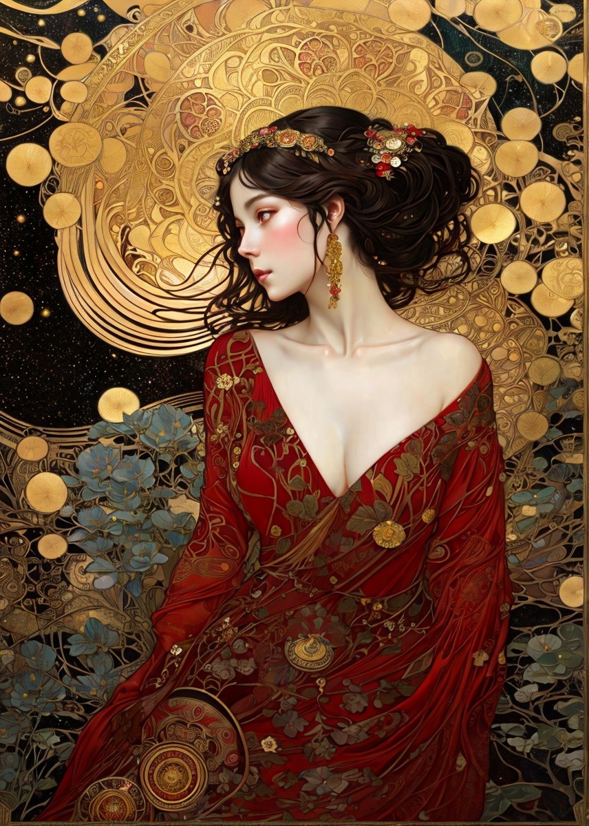 + Prompt:painting of a woman in a red dress with a gold background, intricate oil painting artwork, mucha klimt and tom bagshaw, intricate beautiful painting, alphonse mucha and alena aenami, by Yang J, inspired by Takato Yamamoto, beautiful gorgeous digital art, beautiful intricate oil painting, style of karol bak, painting of beautiful, nouveau painting masterpiece