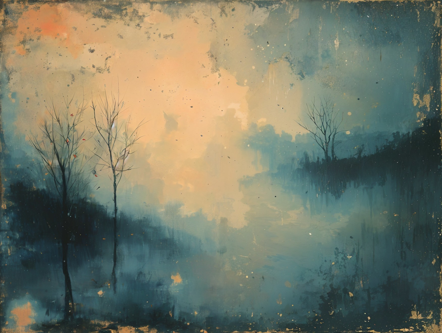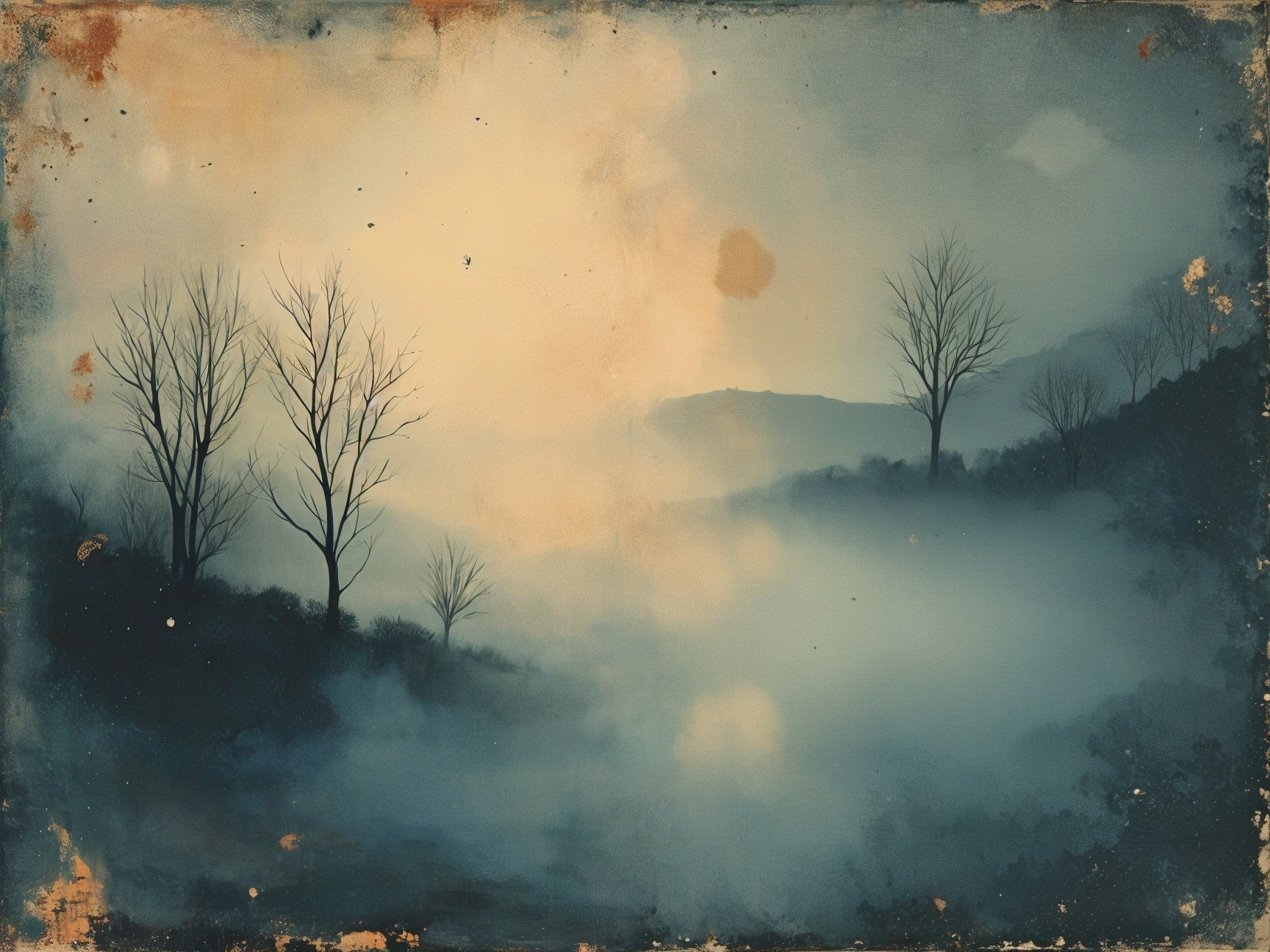 A misty evening scene depicts silhouetted houses under a hazy sky, with muted colors and soft lights glowing from windows. Bare trees add a touch of mystery to the tranquil landscape.