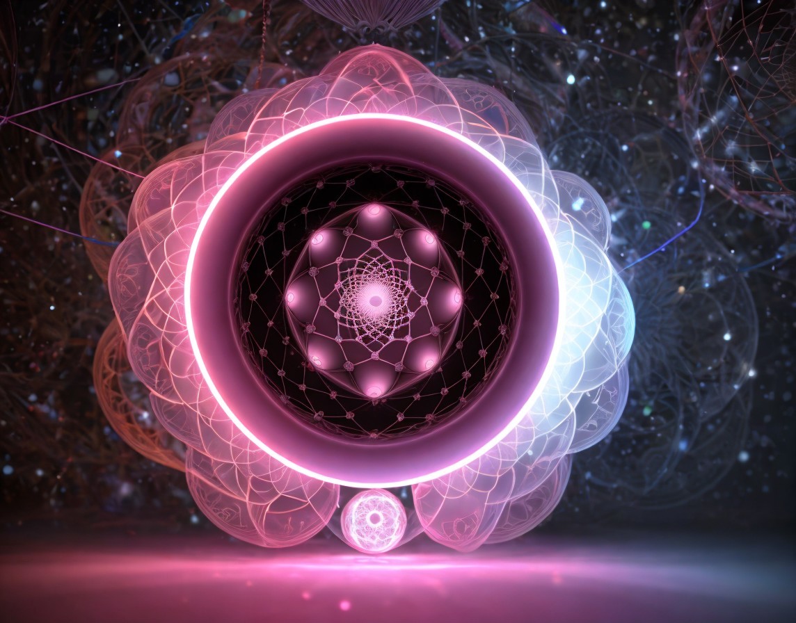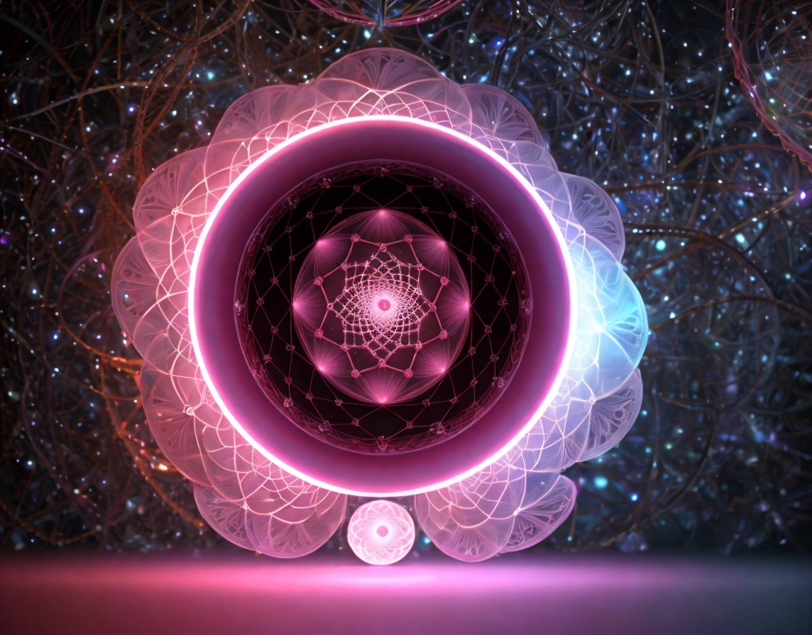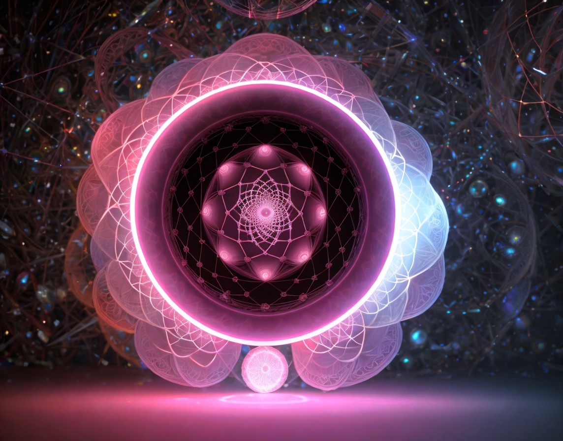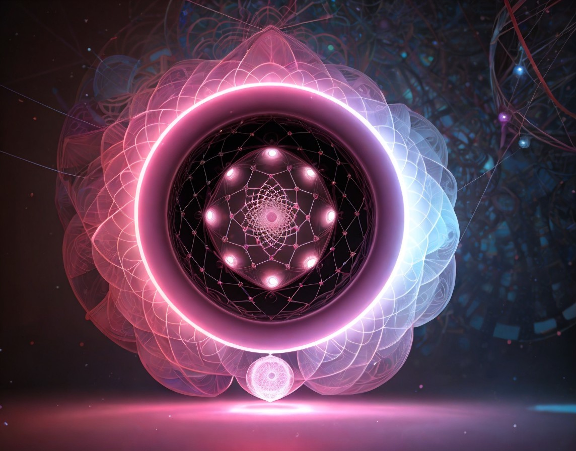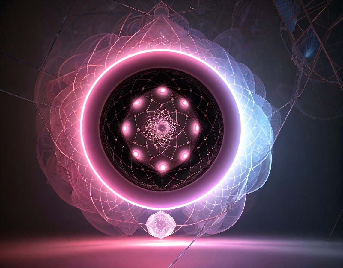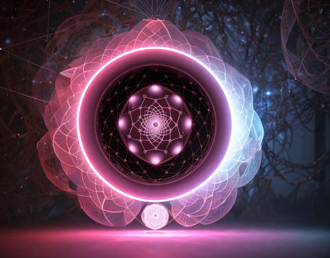 Colorful digital artwork featuring glowing geometric shapes and fractal design on intricate network backdrop.