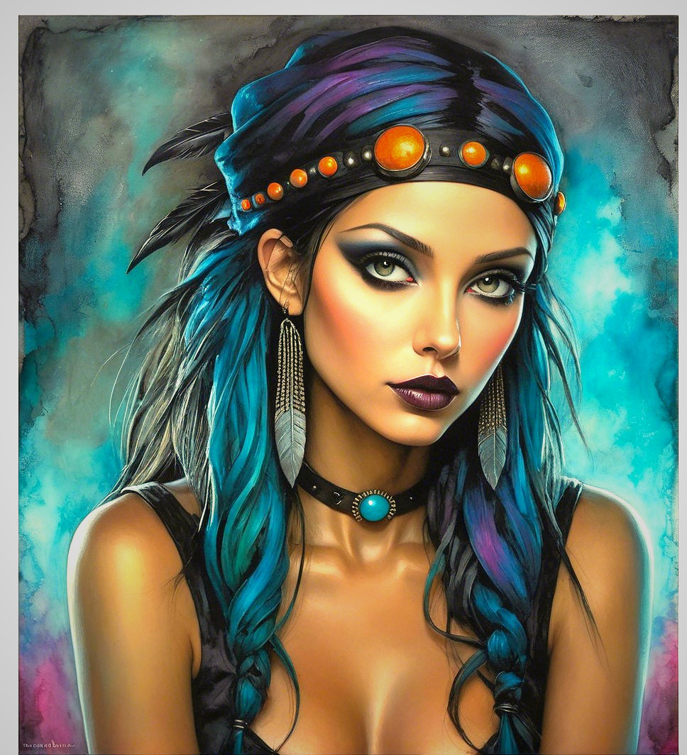 A striking portrait of a woman with vibrant teal and purple hair. She wears bold makeup and intricate accessories, including earrings and a choker, set against a dreamy, colorful background.