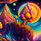 A vibrant, surreal landscape features colorful, swirling mountains and fantastical trees under a cosmic sky filled with bright planets. The scene bursts with neon hues and dreamlike forms.