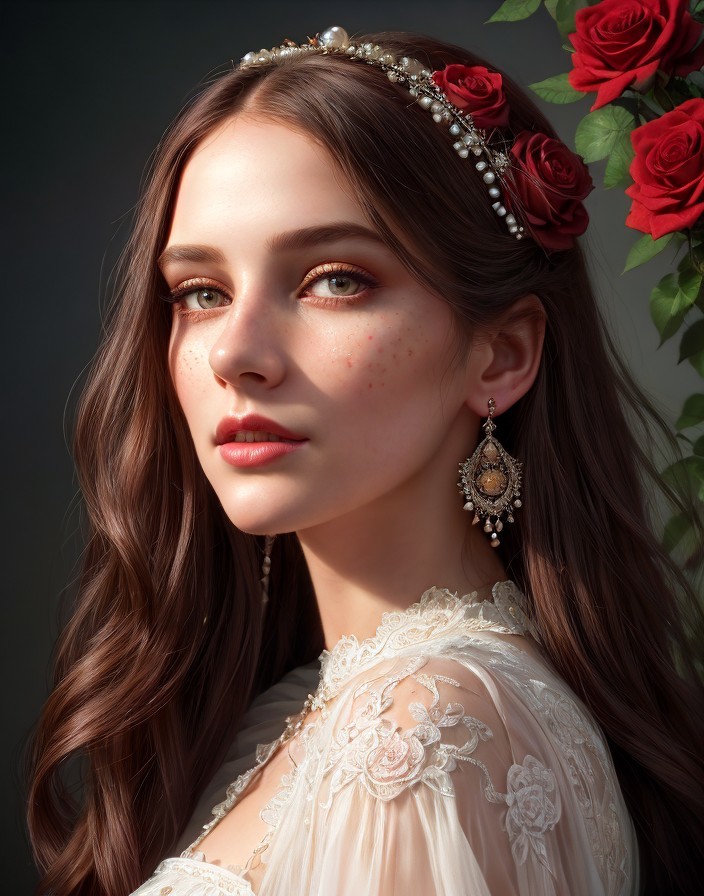 Prompt: "Beautiful young girl, fair and radiant skin, insanely detailed and intricate brown flowing lace long hair and pearl dress with wild wiry beautiful face, white and red roses, highly intricate hyperrealism, delicate detailed complex, vibrant colors, red roses by Tom Bagshaw, Asher Brown Durand, Beeple, Todd McFarlane, Ralph Steadman, Anna Dittmann, Dan Mumford, Magali Villeneuve"