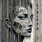 A striking monochromatic portrait of a woman, her face intricately composed of geometric shapes and patterns. Bold lines and textures create a dynamic interplay of light and shadow.