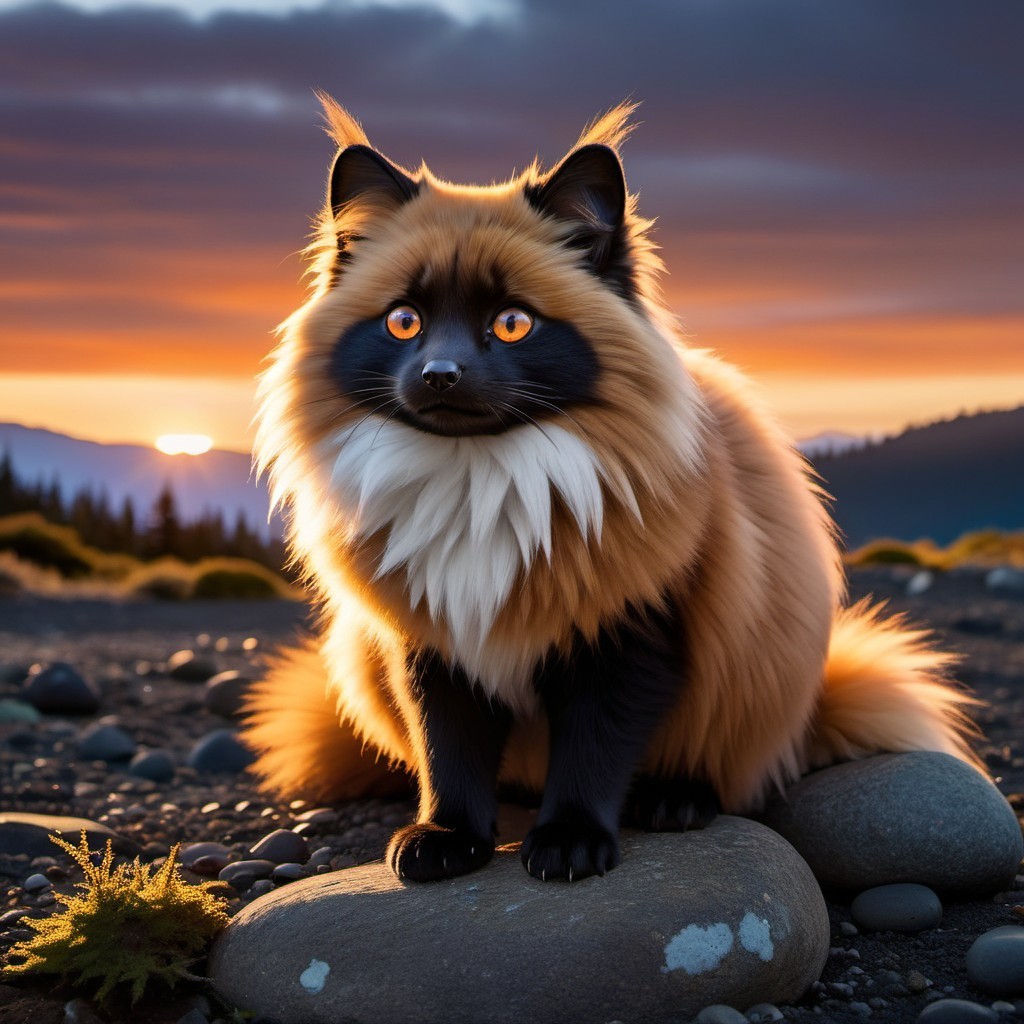 A fluffy creature with striking eyes sits on a rock against a backdrop of a vivid sunset with mountains.