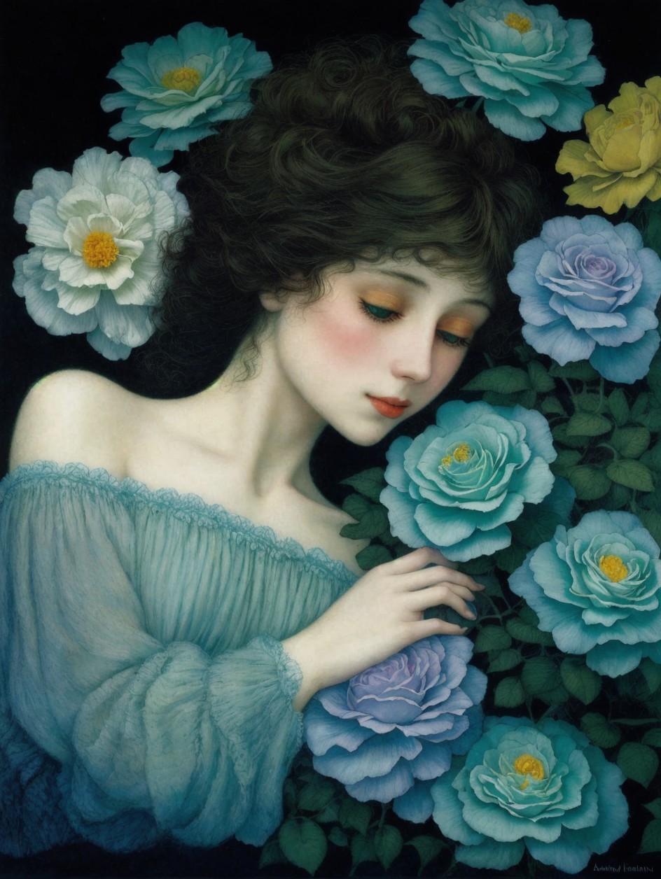 + Prompt:Single image. When I think about my time with him, it was mindblowingly tender. Insanely delicate, but with a physicality that makes me ache. colors: seafoam, green, marigold, flame, scarlet, french rose.