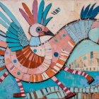 The image features a colorful mosaic of a stylized bird with vibrant, spread wings. Rich patterns in blues, pinks, and earthy tones complement the intricate design against a bright background.
