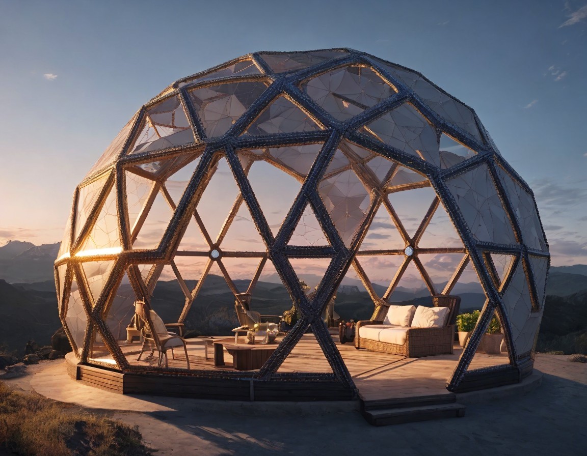 A luxurious geodesic dome with transparent panels overlooking a serene landscape at sunset, furnished with stylish outdoor seating.