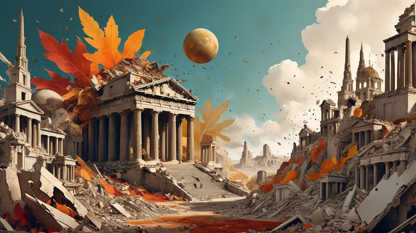 An ancient, crumbling cityscape with classical architecture amid vibrant autumn leaves. A distant planet hangs in a bright sky, enhancing the surreal, post-apocalyptic atmosphere.