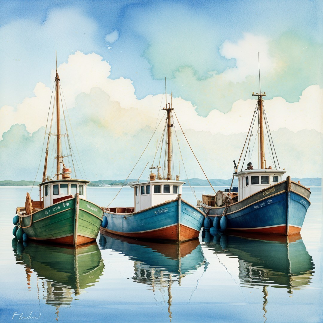 A serene watercolor scene depicts two weathered fishing boats on calm waters, with a lone fisherman in a small wooden boat. Soft clouds and flying birds enhance the tranquil atmosphere.