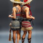 Two fashion models stand back-to-back, showcasing vibrant, patterned dresses with fringes. They wear large decorative hats, exuding a stylish, modern take on traditional western attire.