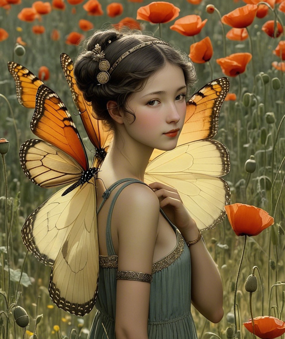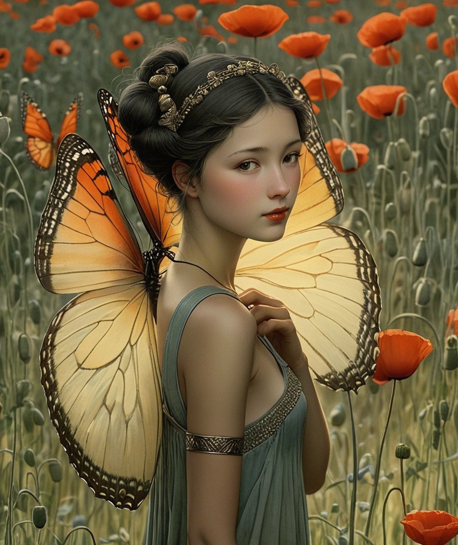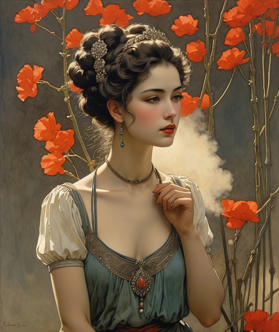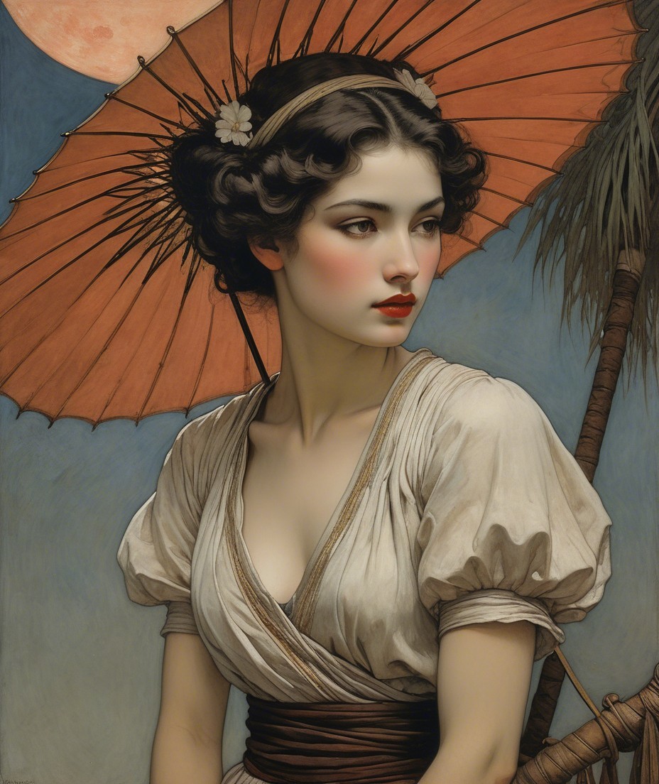 A young woman with soft curls and rosy cheeks stands by the ocean, holding a red parasol. She wears an elegant dress, exuding vintage charm against a serene moonlit background.