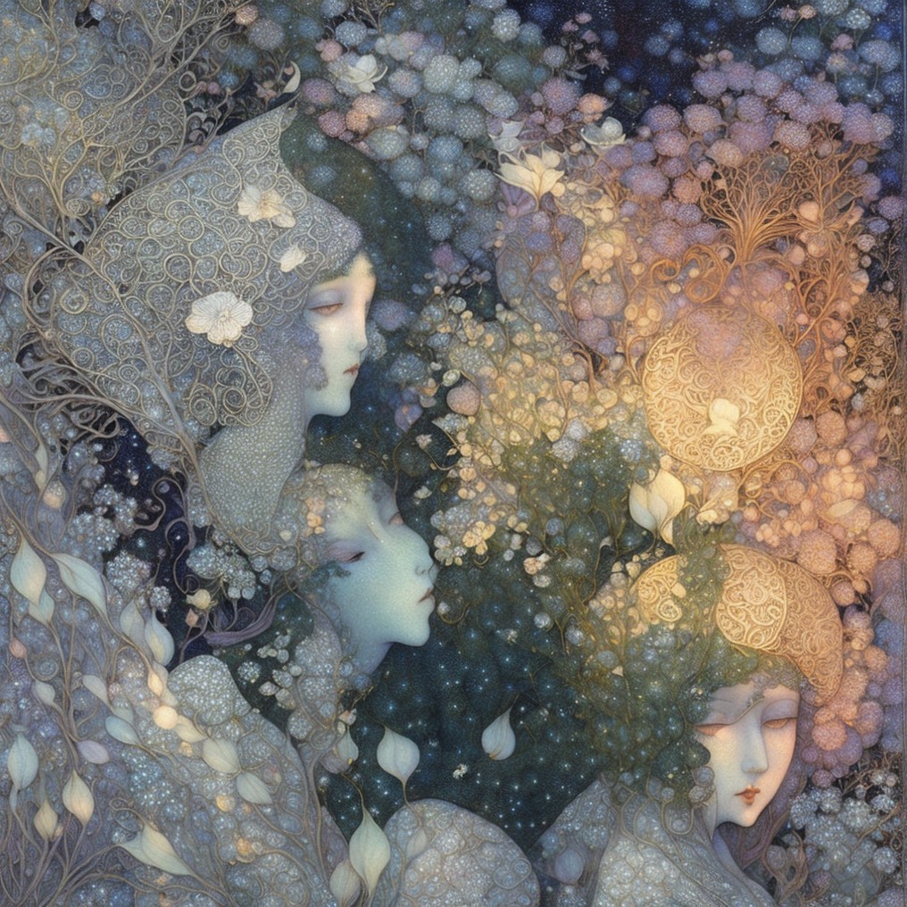A mystical, pale-skinned woman with intricate, flowing hair and a delicate butterfly nearby gazes thoughtfully at a glowing orb atop a floral stem, set against a starry night background.
