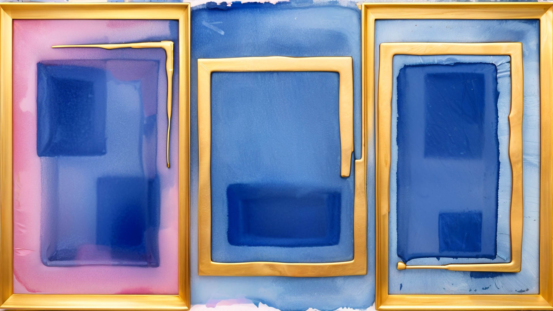 Prompt: "create an abstract painting of frames Mark Rothko-style in shades of soft blue, indigo, pink and golden colors post-impressionism modern art modern European ink painting golden ratio"